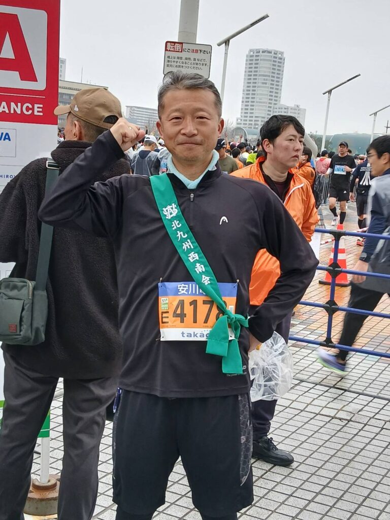 昨年の北九州総会でもお披露目しました新しいタスキ(西南学院大学のロゴと「北九州西南会」と入ったもの)をかけて20.7㌔マラソンを走りました!